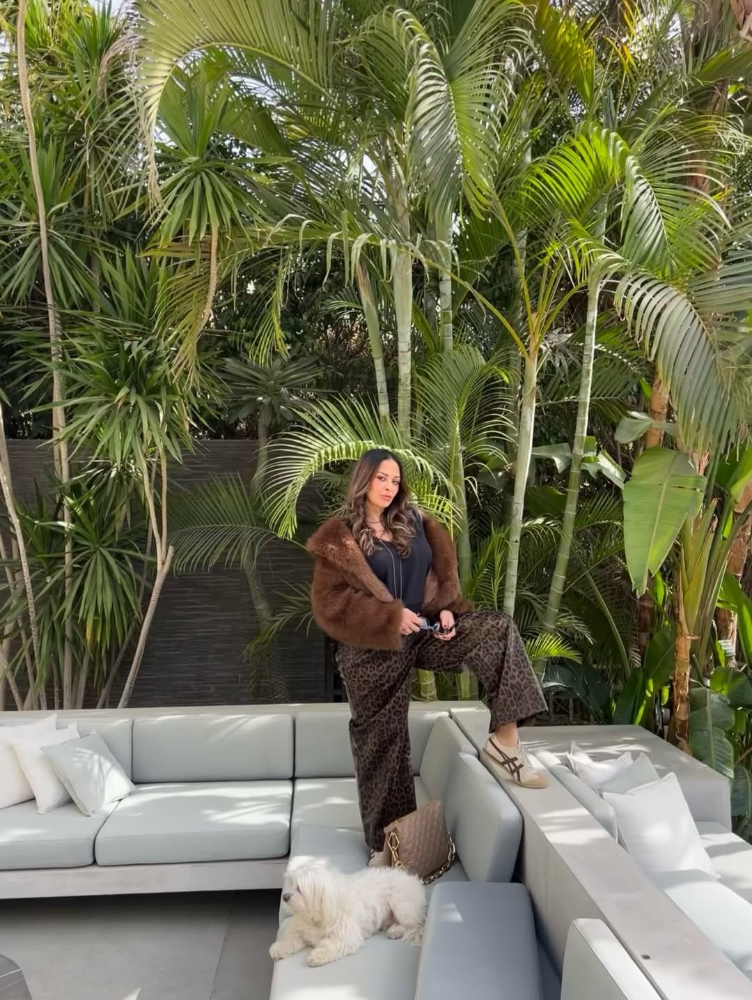 وتألقت داليا البحيري بإطلالة شتوية عبارة عن بنطال واسع من الساتان بنقشة الفهد باللون البنّي، نسقته مع توب واسعة باللون الأسود، وجاكيت من الفرو البنّي، في إطلالة غير تقليدية تجمع بين الكاجوال والفخامة.