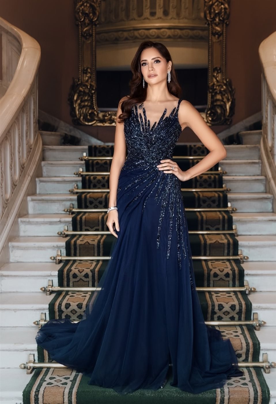 الفستان جاء بلون كحلي عميق يمنح الإطلالة وقارًا وأناقة ملكية، مع قصة ضيّقة عند الخصر تنساب برشاقة على القوام.