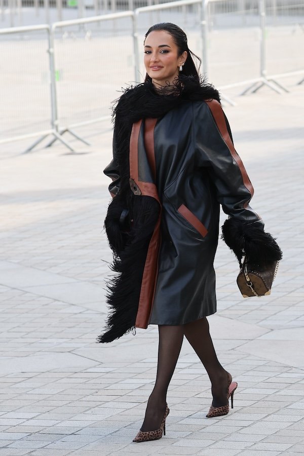 وتطريز ريشي أسود على الياقة والأكمام وأطراف المعطف، ما منح إطلالتها لمسة درامية أنيقة.