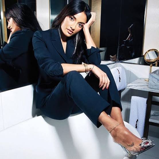 تميّز ببلوزة ساتان عالية الرقبة مع كشكش درامي على الكتفين والصدر، وأكمام مفتوحة، نسّقتها مع شورت أبيض بطول الركبة.