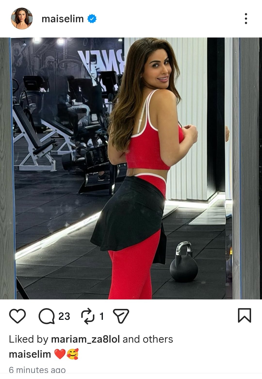 وتألقت مي سليم بإطلالة جذابة لافتة، من داخل الجيم بملابس رياضية جريئة باللون الأحمر، أبرزت رشاقتها وجمالها.