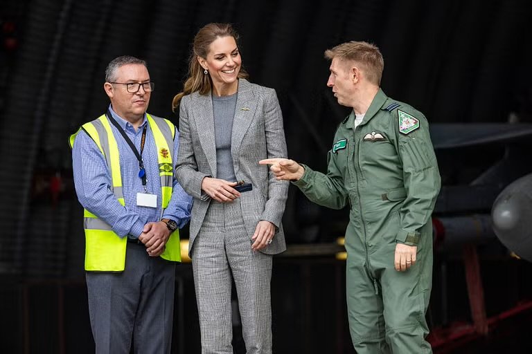 ظهرت الأميرة كيت خلال زيارتها لقاعدة RAF كونينغسبي الجوية في مقاطعة لينكولنشاير البريطانية بإطلالة أنيقة مؤلفة من بليزر رمادي كاروهات بقصّة ضيقة، وبنطال بخصر عالٍ مستقيم القصة.