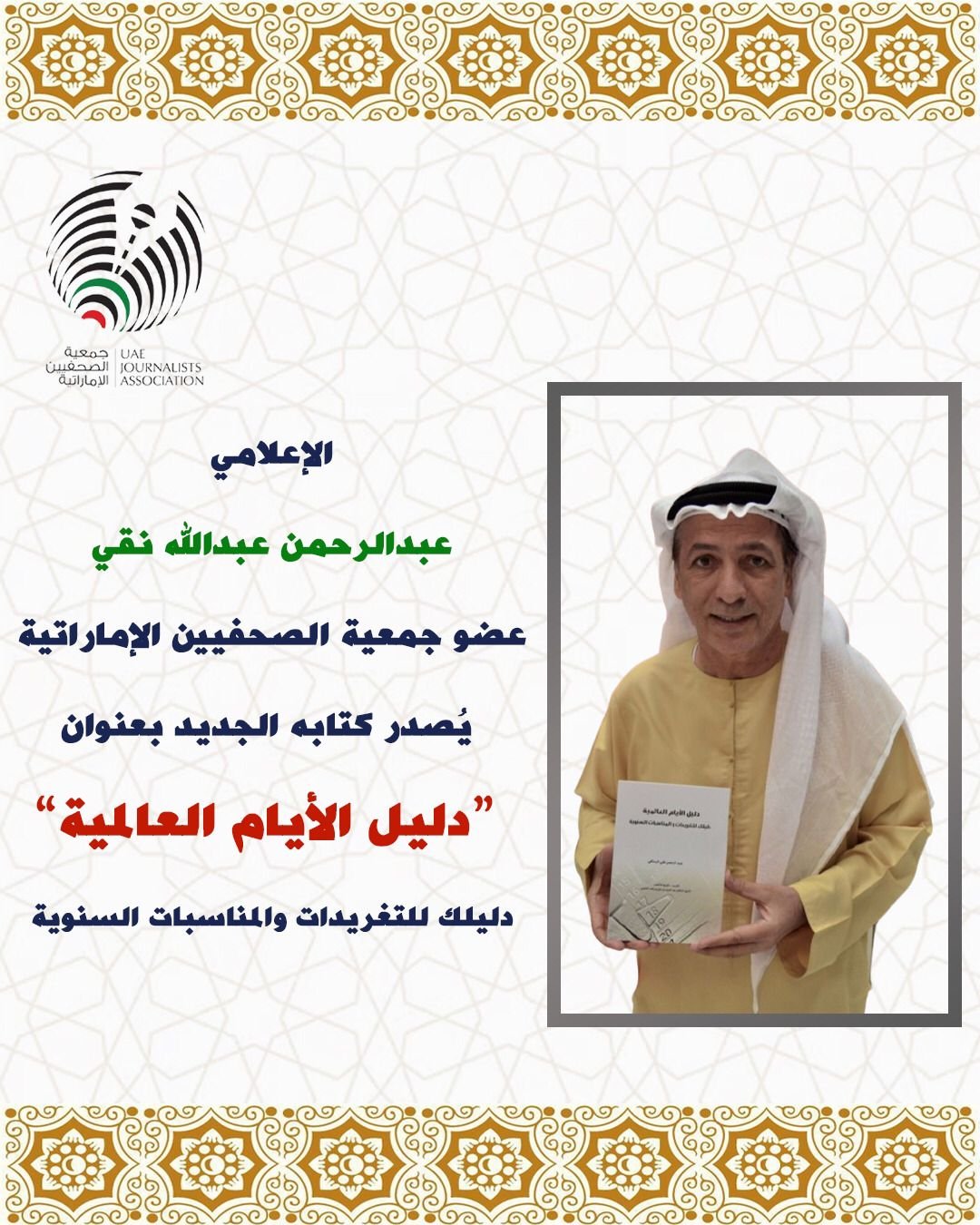 وقع الزميل الإعلامي عبدالرحمن عبدالله نقي، عضو جمعية الصحفيين الإماراتية، إصداره الجديد بعنوان “دليل الأيام العالمية”، والذي يمثل مرجعًا شاملًا لتواريخ المناسبات العالمية والمحلية على مدار العام، ويسهّل متابعة الأيام العالمية والوطنية وتنظيم الفعاليات المرتبطة بها.
