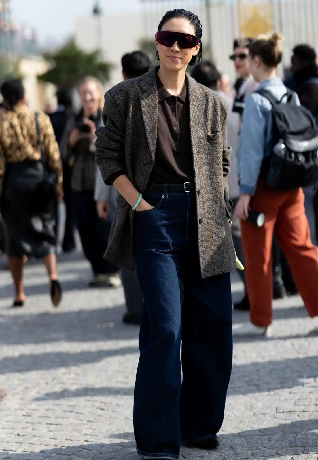 الطبقات أو الـ layering سر الإطلالة الفخمة في الأجواء الباردة. جينز أزرق داكن مع بولو وبليزر بني، وحذاء كلاسيكي، يضمنان مظهراً أنيقاً. لمسة عصرية إضافية يمكن أن تكون نظارة شمس باللون النبيتي الغامق، أو سويتر بني بدرجة أغمق فوق القميص لإضافة العمق والأناقة.