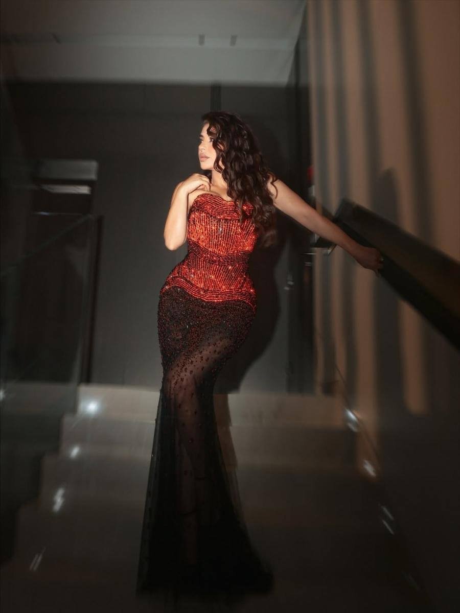 - ساشا دحدوح أطلت بفستان بقصة حورية البحر من شربل زوي، باللونين البرتقالي والأحمر الناري، مطرّز بالكامل وبياقة قلب مكشوفة، وأكملت الإطلالة بمجوهرات Yeprem.