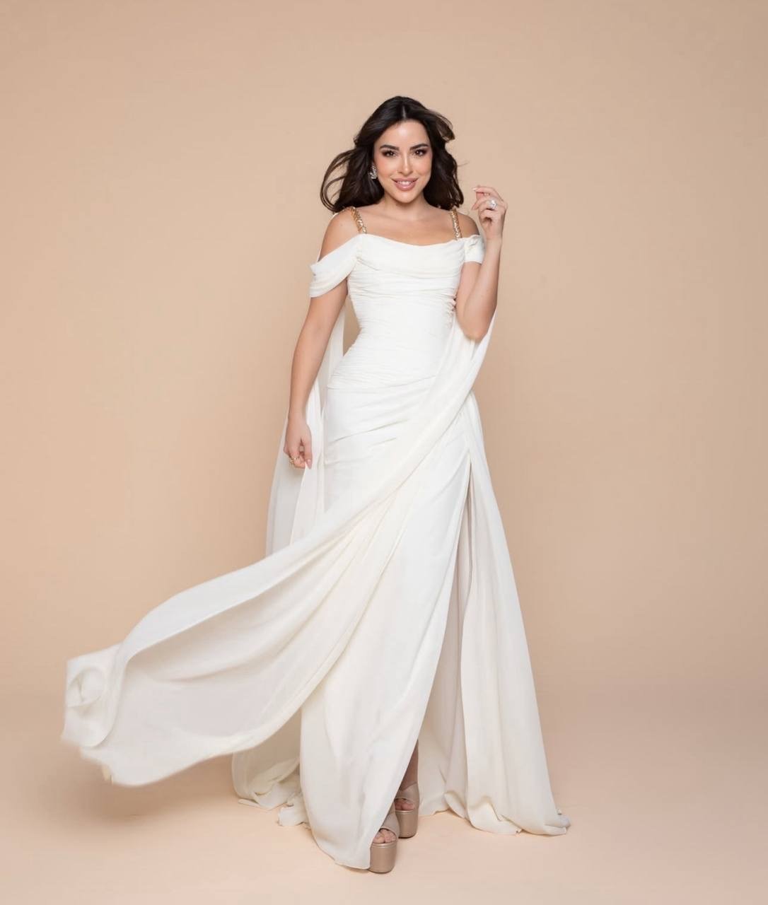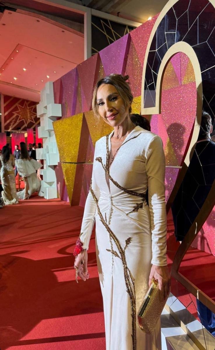 - ورد الخال أطلت بفستان طويل أبيض مائل إلى العاجي، تزيّن بتطريزات برونزية وذهبية مع أزرار على الخصر وفتحة أمامية أضافت جاذبية خاصة.