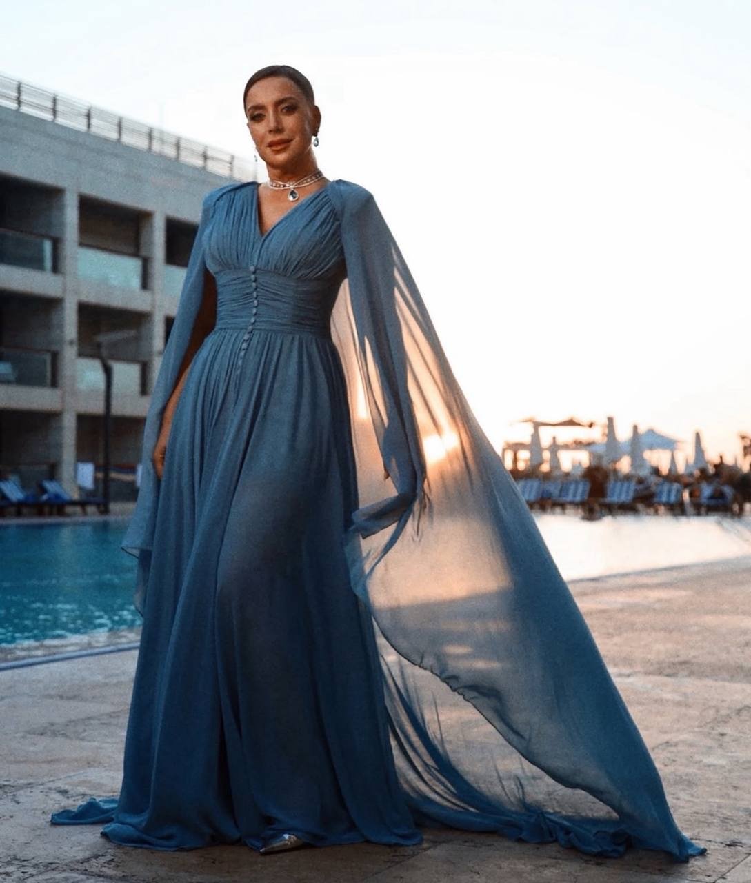 - شكران مرتجى خطفت الأنظار بفستان أزرق هادئ مع ياقة على شكل V وأزرار عند الخصر، فيما أضافت التنورة الواسعة والأكتاف على شكل كاب لمسة شرقية مميزة.