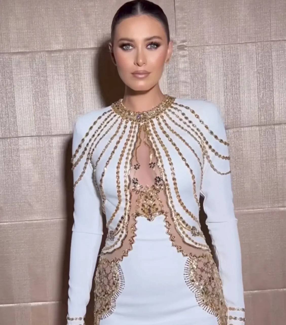 - ندى كوسا ظهرت بفستان ضيق أبيض من رامي سلامون مطرّز بالفضي عند الصدر والخصر، ما أضاف لمسة راقية لإطلالتها.