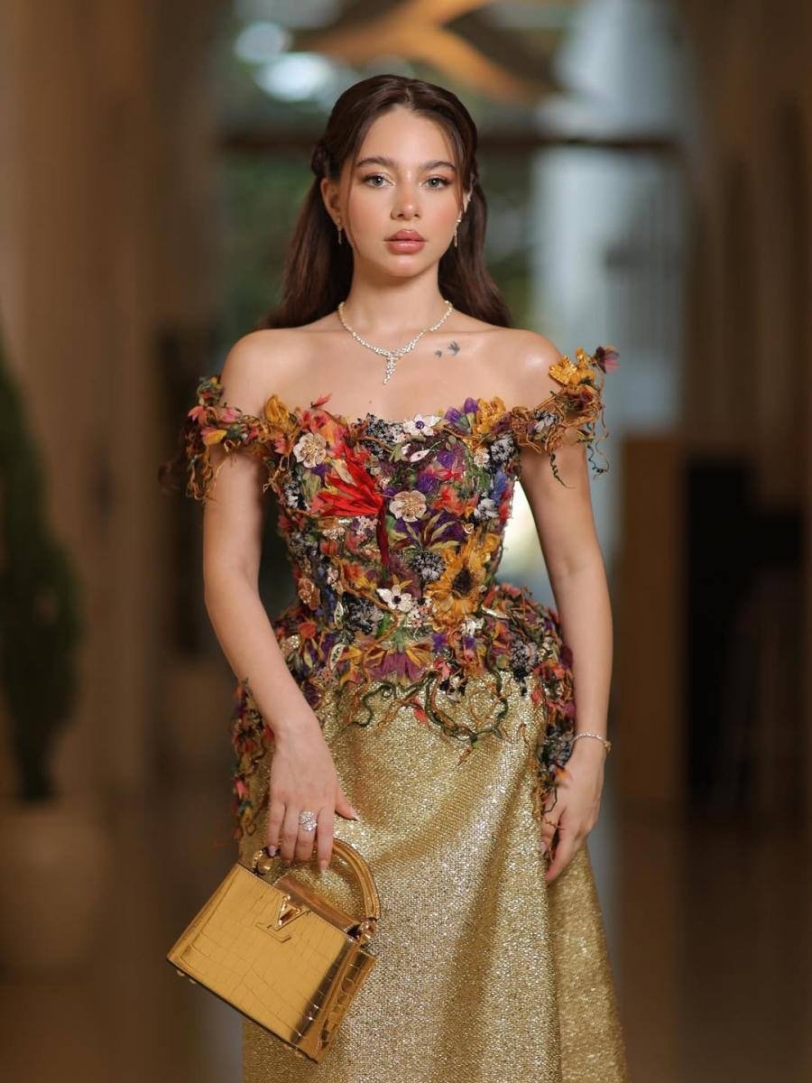 - بيسان إسماعيل اختارت فستاناً ذهبياً لامعاً من هويدا بريدي، مزداناً بزهور ملوّنة عند الصدر، نسّقته مع حقيبة من “لويس فويتون” ومجوهرات من الذهب والألماس.