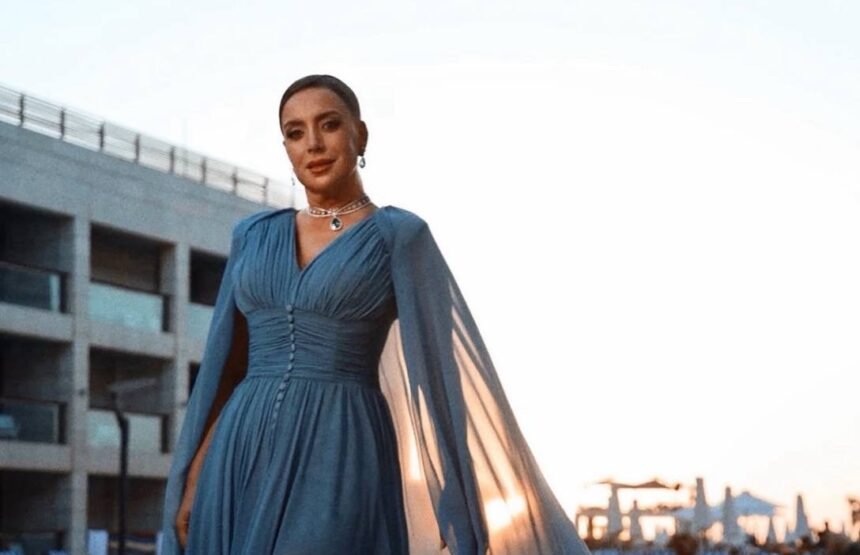 - ريتا حايك اختارت فستاناً من حسن إدريس مستوحى من الطراز اليوناني، تزيّن بنقوش متداخلة بالبيج والبني مع لمسات تركواز.