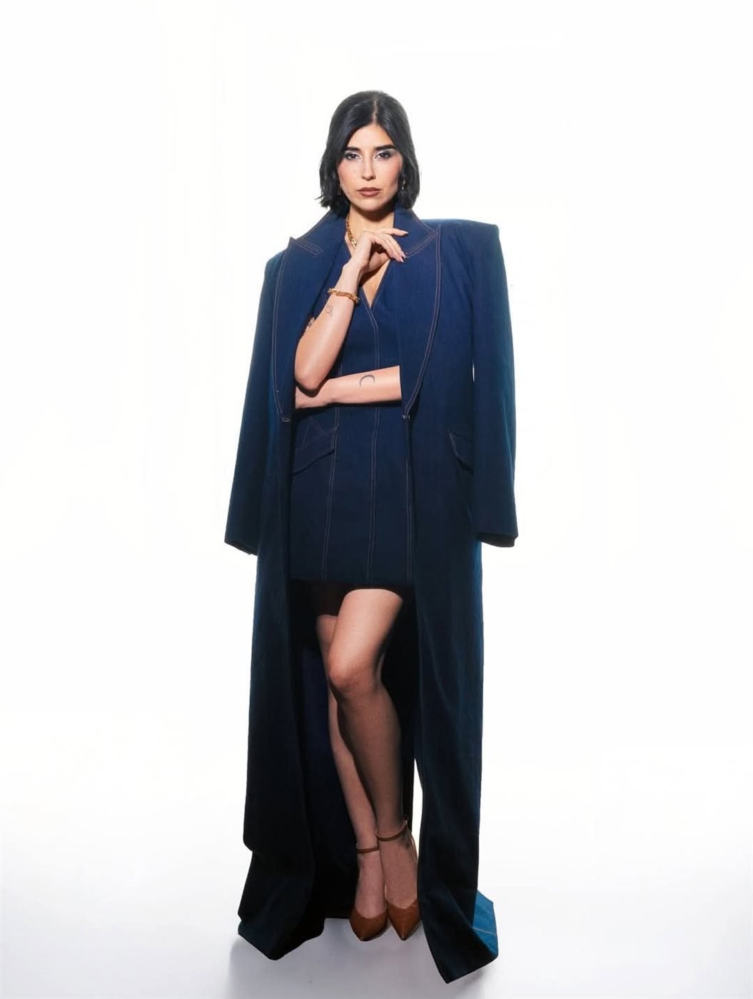 ولإكمال اللوك، نسّقت زينة الفستان مع معطف واسع باللون الكحلي، ما أضفى لمسة من الفخامة والاتزان وخلق توازنًا بصريًا بين الطابع العملي للدنيم وأناقة المناسبات الرسمية.