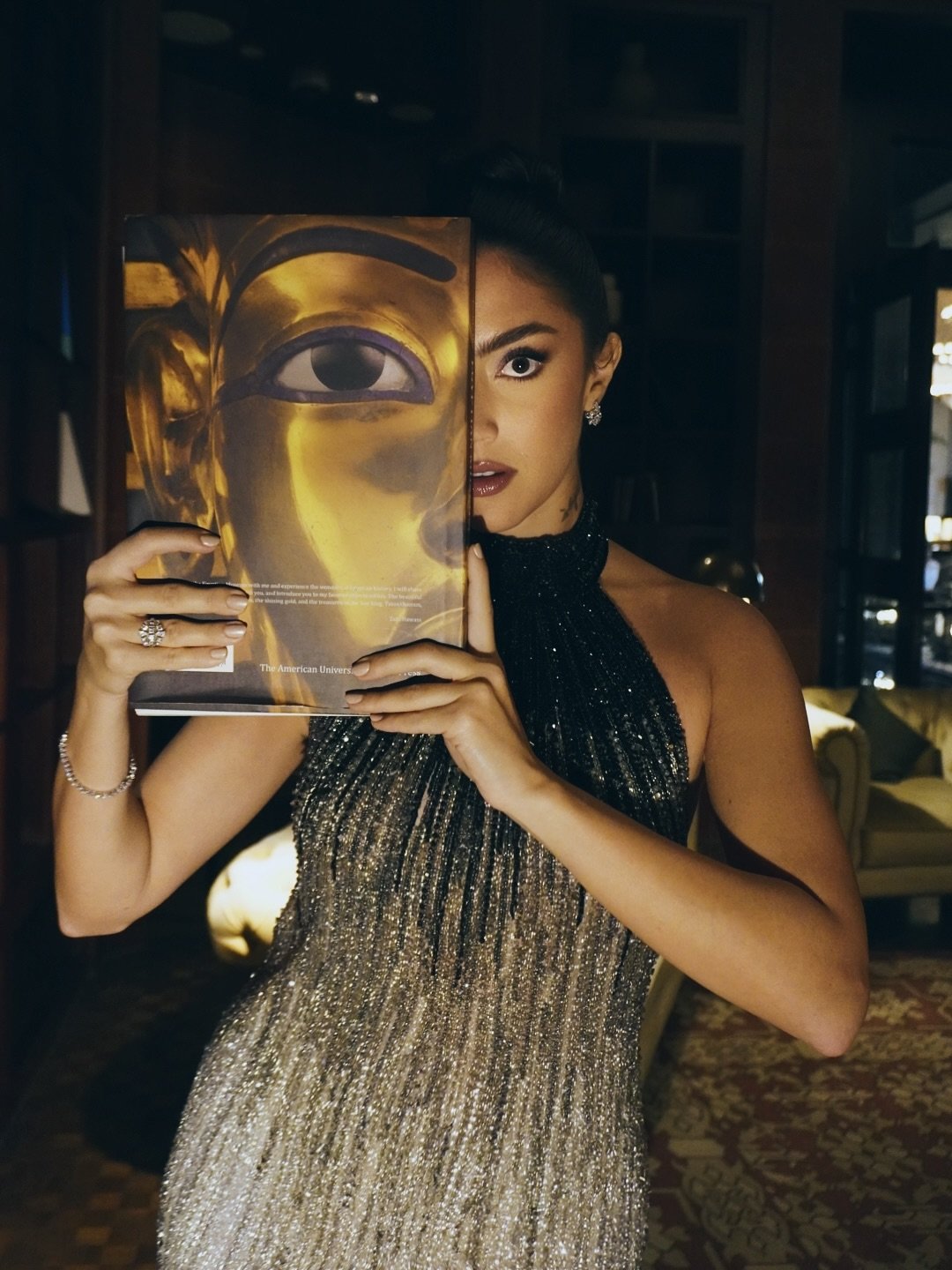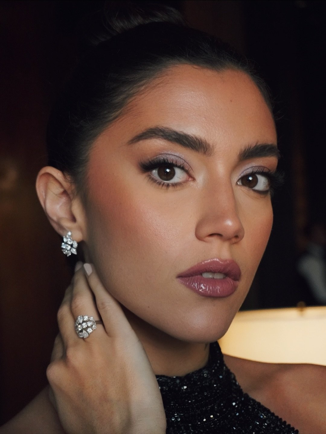 ونفّذت لها خبيرة التجميل نيفين سليم مكياج عينين يحاكي بريق فستانها، باستعمال ظلال فضيّة وامضة فوق الجفن المتحرّك ولمسات برونزيّة ودخانيّة عند طرف الجفنين (من الزاوية الخارجيّة).