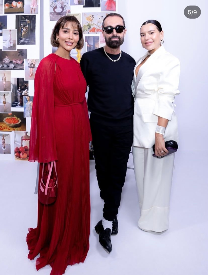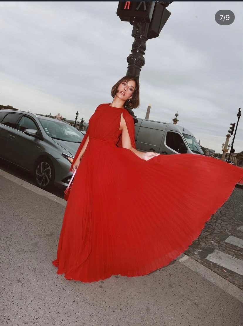 ظهرت بفستان طويل باللون الأحمر الصارخ، تميّز بتصميمه الناعم ذي الأكمام المنفوخة، وصُنع من قماش الشيفون الذي منحها مظهرًا أنثويًا رقيقًا ومفعمًا بالحيوية.