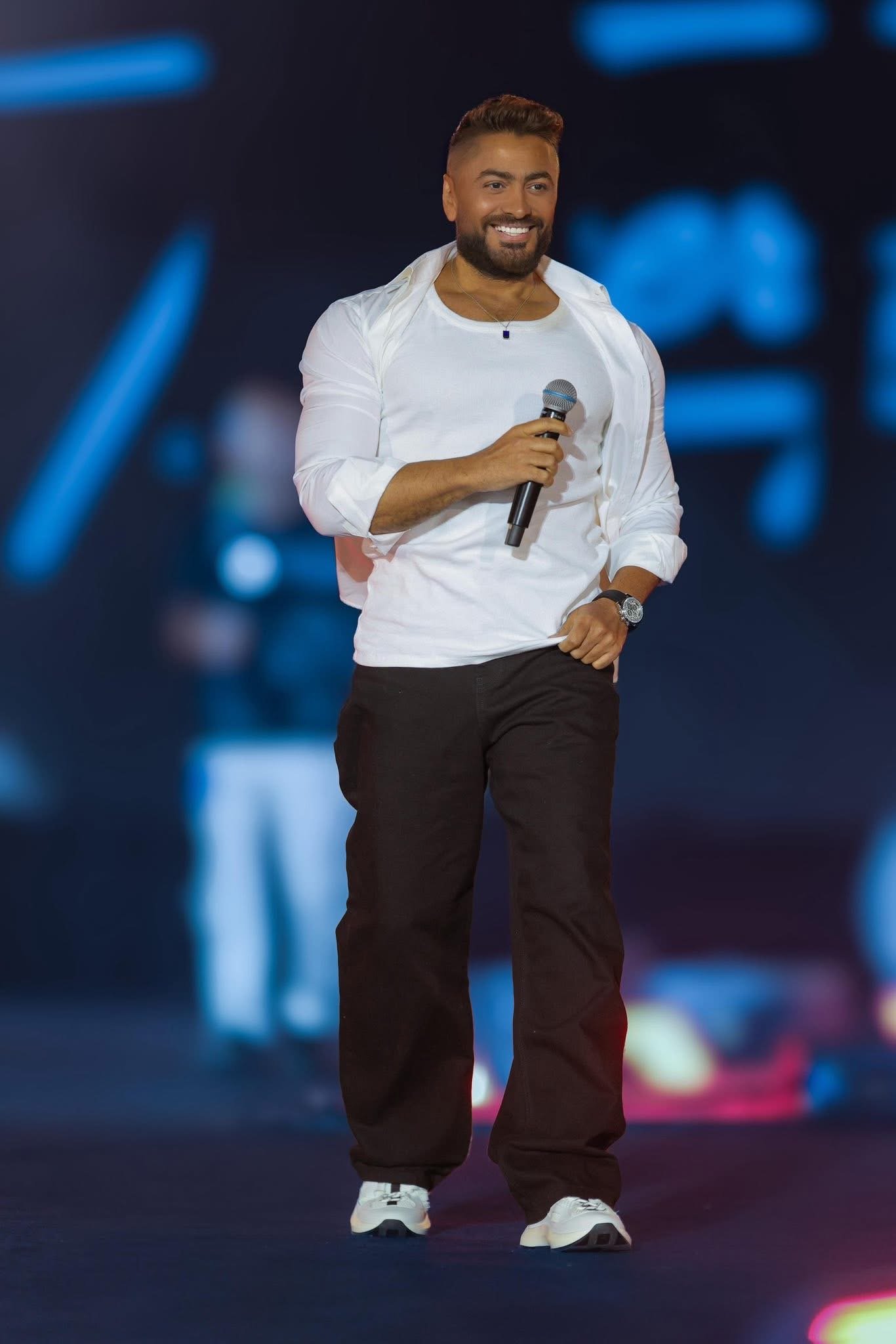كلماته كانت كافية لإشعال موجة جديدة من التصفيق، خاصة بعدما دعا الحضور لترديد أغنية «راجع» معه في مشهد جمع بين العفوية والدفء الإنساني.