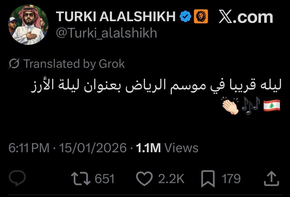 حيث قال فيها: “ليله قريبا في موسم الرياض بعنوان ليلة الأرز”.