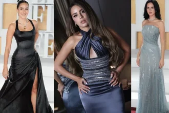 أنيستون خطفت الأنظار بارتدائها فستانًا قصيرًا أسود خلال مشاركتها في برنامج The Late Show with Stephen Colbert. الفستان تميز بياقة عالية على طراز الهالتر، مع خامة لامعة قليلًا وقصّة منخفضة الخصر تحولت إلى تنورة قصيرة بطيّات بارزة، مُزودة بحزام داخلي مع إبزيم ذهبي منح التصميم لمسة كلاسيكية راقية.