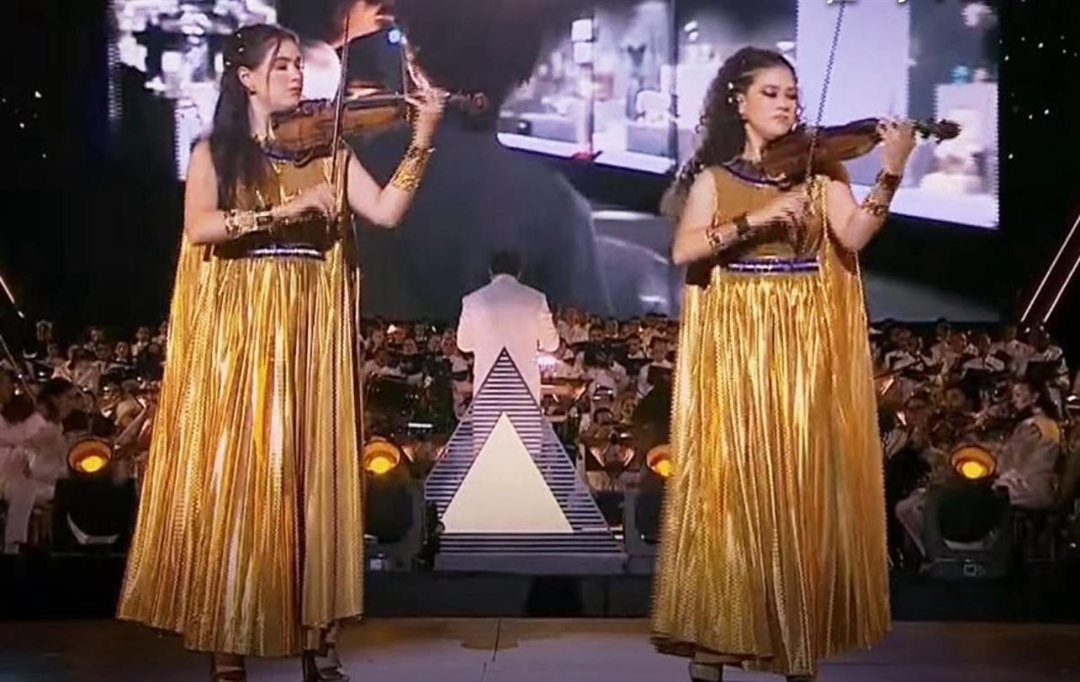 خطفَت العازفتان مريم وأميرة أبو زهرة، حفيدتا النجم الكبير عبد الرحمن أبو زهرة، الأضواء خلال حفل افتتاح المتحف المصري الكبير.