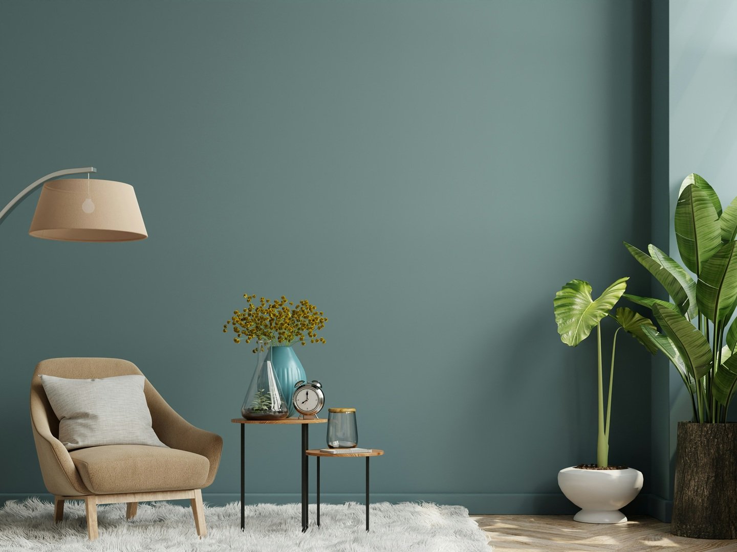 مزيج بين الأزرق والأخضر يمنح الجدران عمقاً وأناقة، ويشكّل خلفية مثالية للألوان الدافئة مثل الكراميل والنحاس.