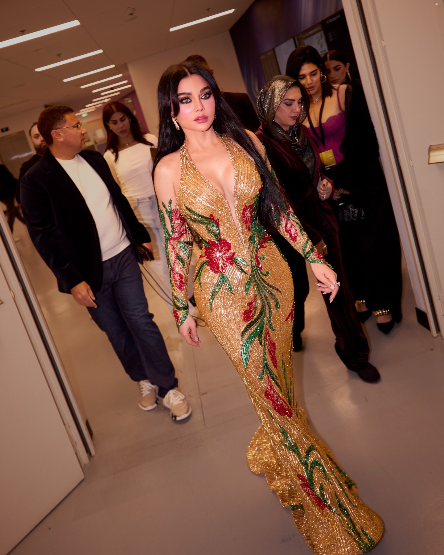 نسق المصمم اللونين الأحمر والأخضر فوق قاعدة ذهبية لامعة. لذلك، منح الفستان حضورًا قويًا على المسرح. وعكس التطريز الكثيف دقة التنفيذ داخل دار رامي سلمون. بدت الورود الحمراء وتيجانها الخضراء نابضة بالحياة فوق نسيج مرصع بالترتر الذهبي والكريستال.