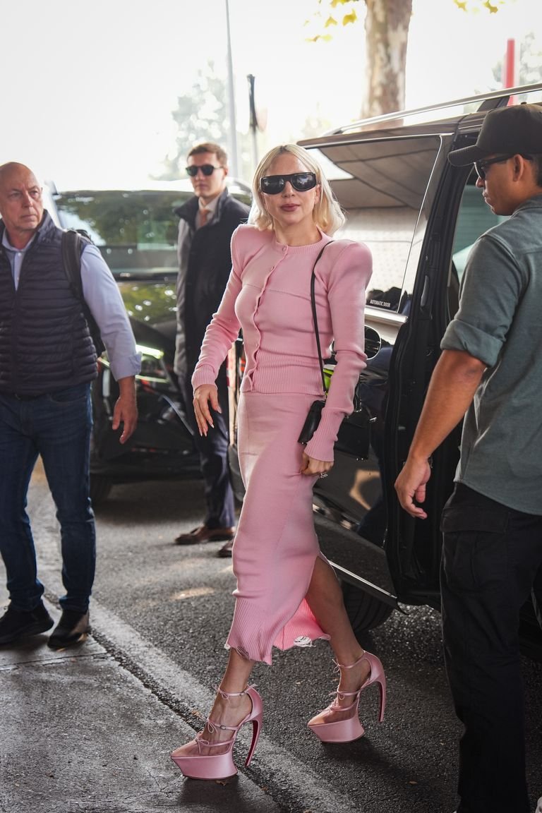 ولم تكتفِ غاغا بالوردي، إذ أضافت لمسة داكنة من خلال نظارات شمسية سوداء ضخمة من Port Tanger وحقيبة صغيرة من Hermès Kelly باللون الأسود، مما أضفى توازناً ذكياً بين الرقة والحدة.