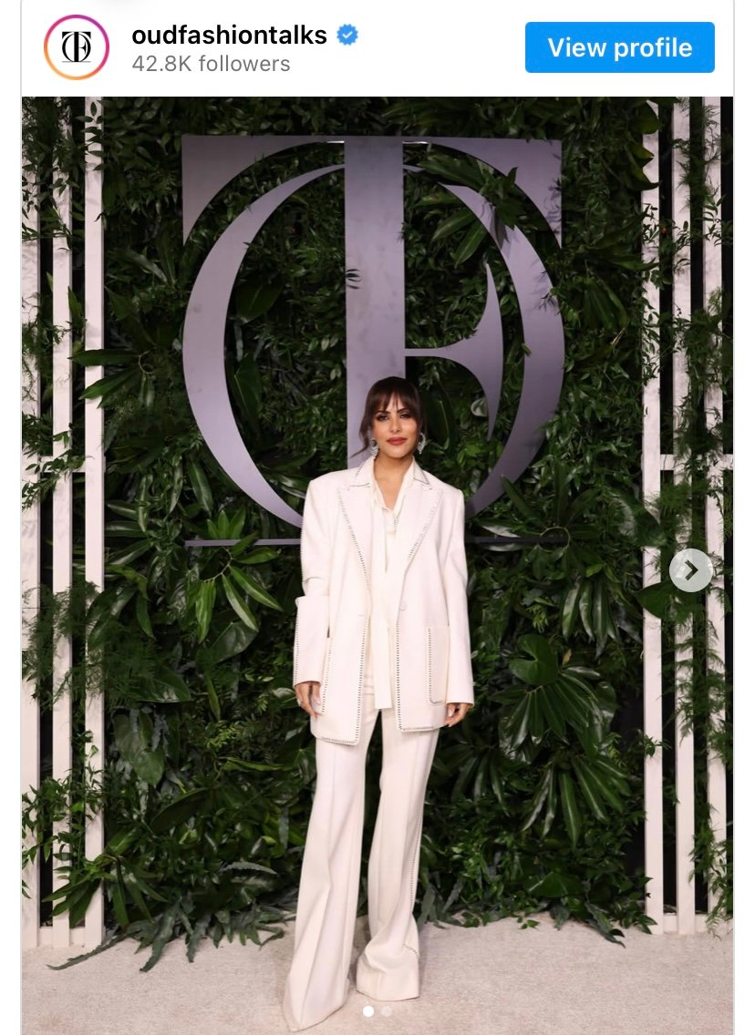 لفتت ندى باعشن الأنظار بطقم أبيض مكون من قميص وجاكيت وبنطال واسع، من تصميم Oud Fashion Talks.