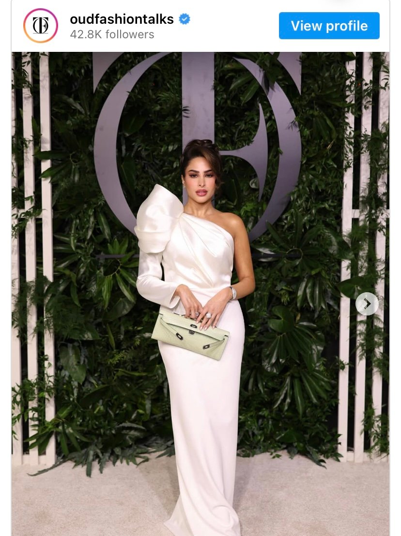 أما فوز الفهد فقد اختارت فستانًا أبيض بقصّة الكتف الواحد مزينًا بتصميم بارز عند الكتف، من توقيع Oud Fashion Talks.