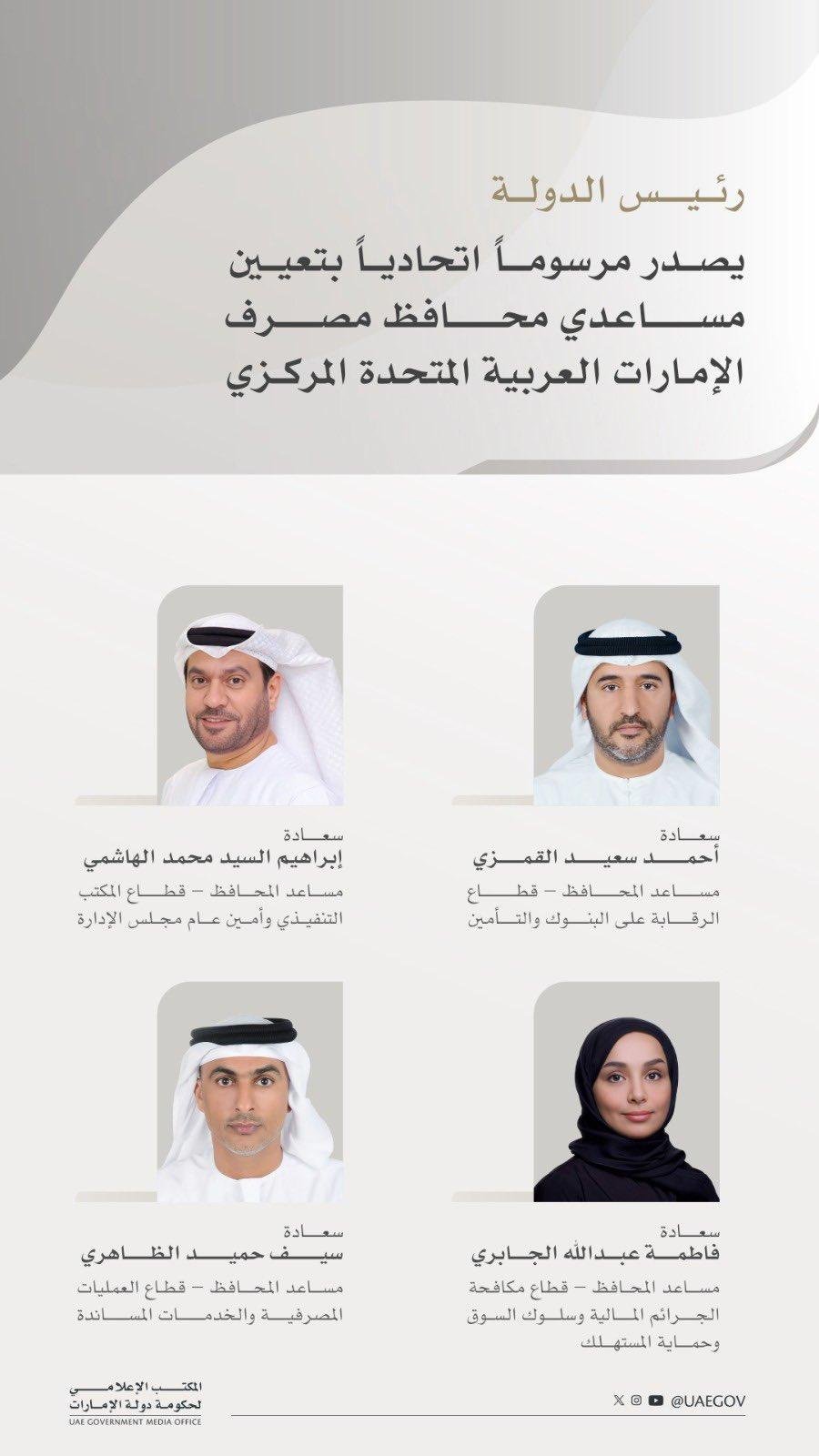 أحمد سعيد القمزي “مساعد المحافظ ـ قطاع الرقابة على البنوك والتأمين”. إبراهيم السيد محمد الهاشمي “مساعد المحافظ ـ قطاع المكتب التنفيذي وأمين عام مجلس الإدارة”. فاطمة عبدالله الجابري “مساعد المحافظ ـ قطاع مكافحة الجرائم المالية وسلوك السوق وحماية المستهلك”.
