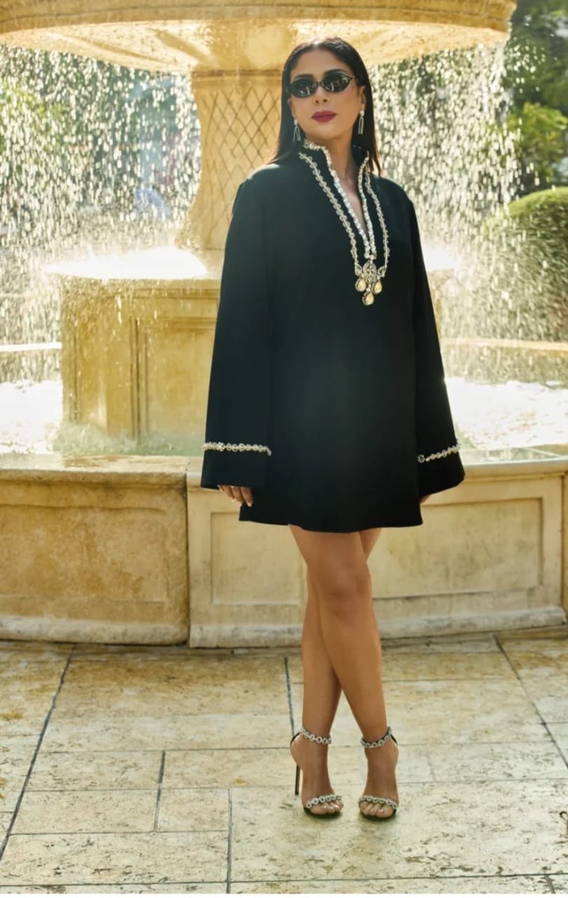 فيما اختارت منى فستانًا قصيرًا أسود من تصميم زهير مراد، جاء من مجموعة خريف/شتاء 2025.