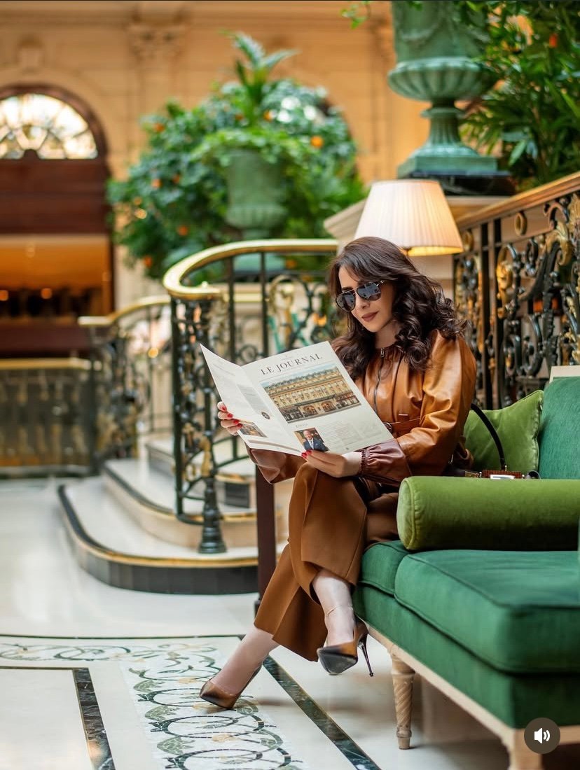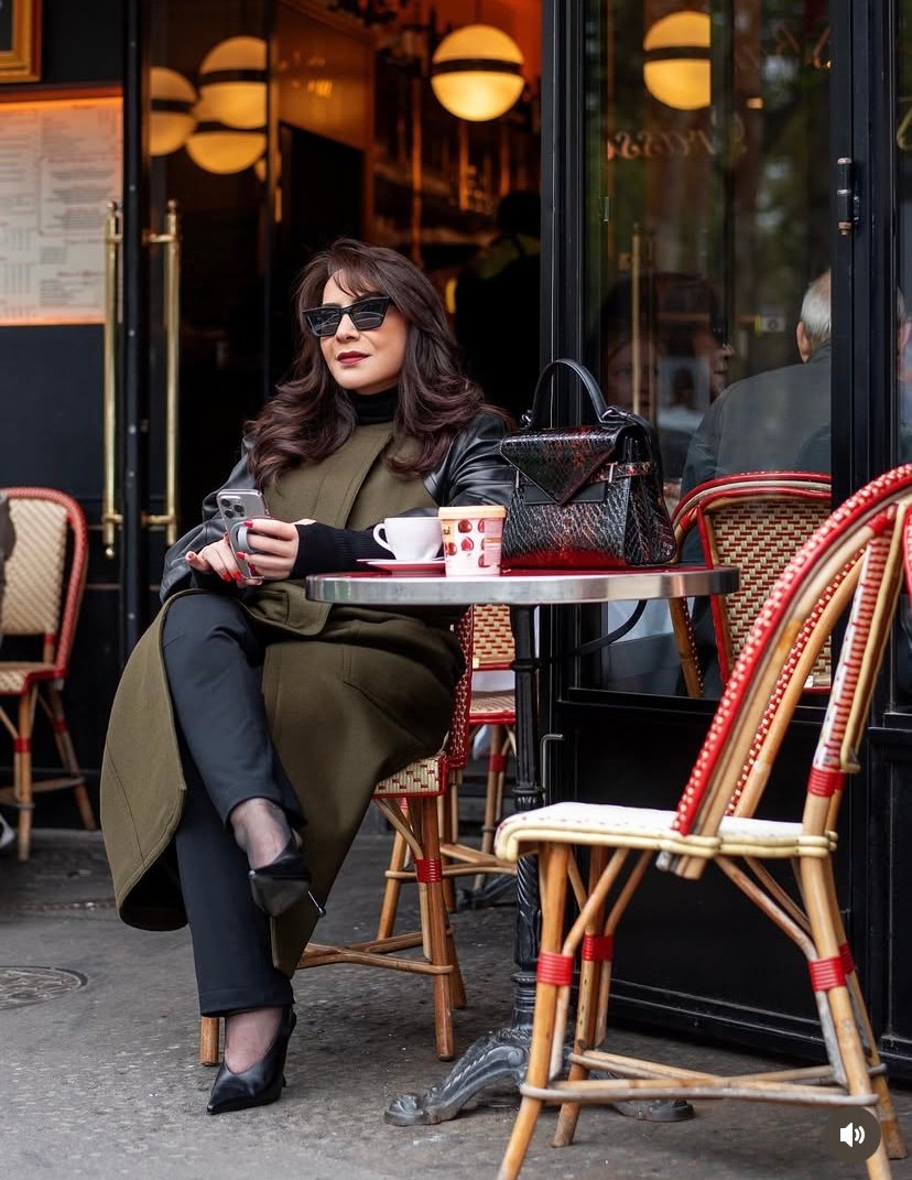 ولتعزيز أناقتها، اعتمدت حذاء Pump أسود ونظارات شمسية داكنة، فبدت بإطلالة راقية تجمع بين الفخامة والرقي الباريسي