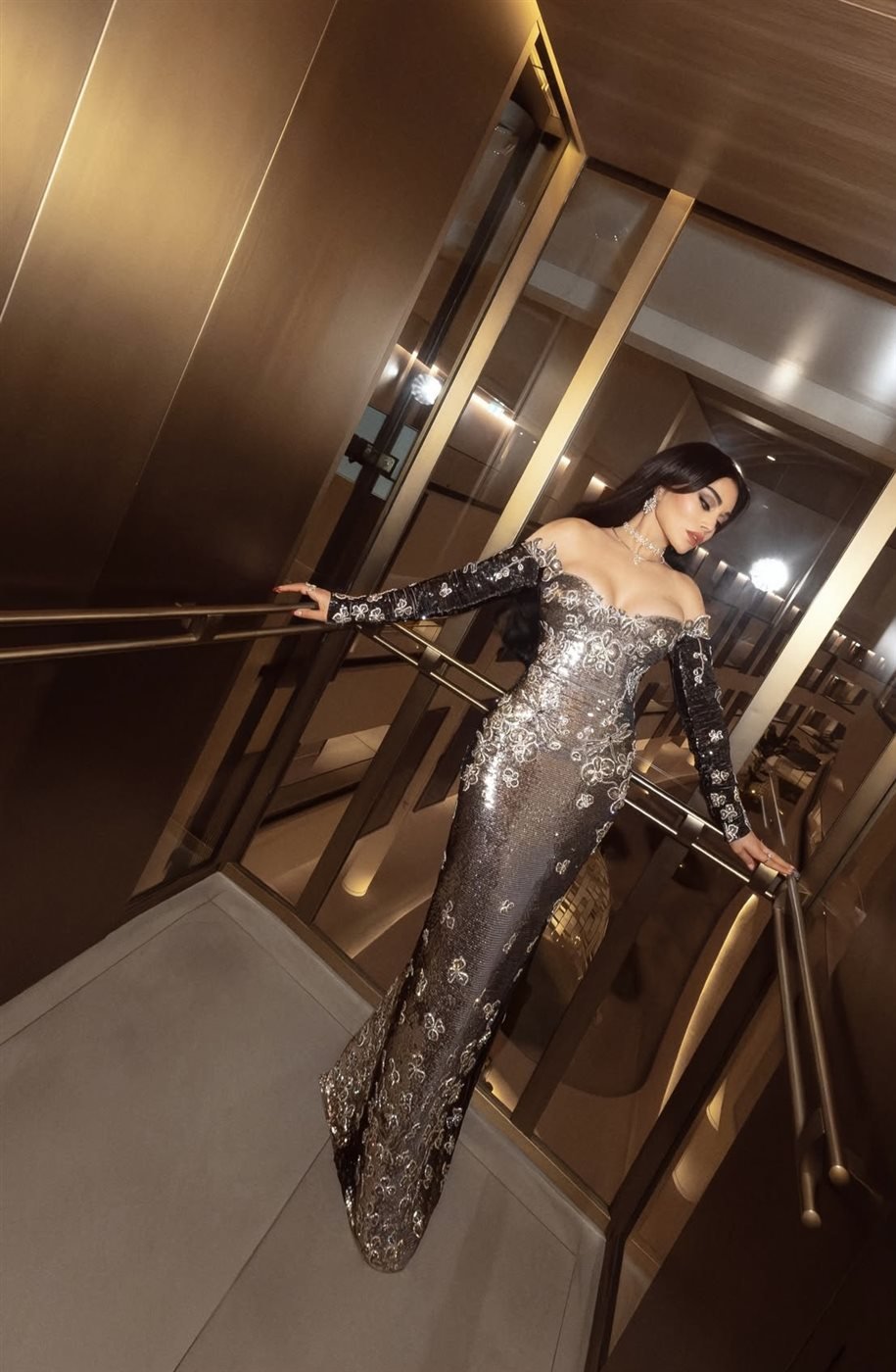ظهرت هيفاء بفستان طويل ضيق بتدرجات اللون الميتالك الفضي، مزين بتطريزات دقيقة أضافت بريقًا خاصًا تحت أضواء الحفل.