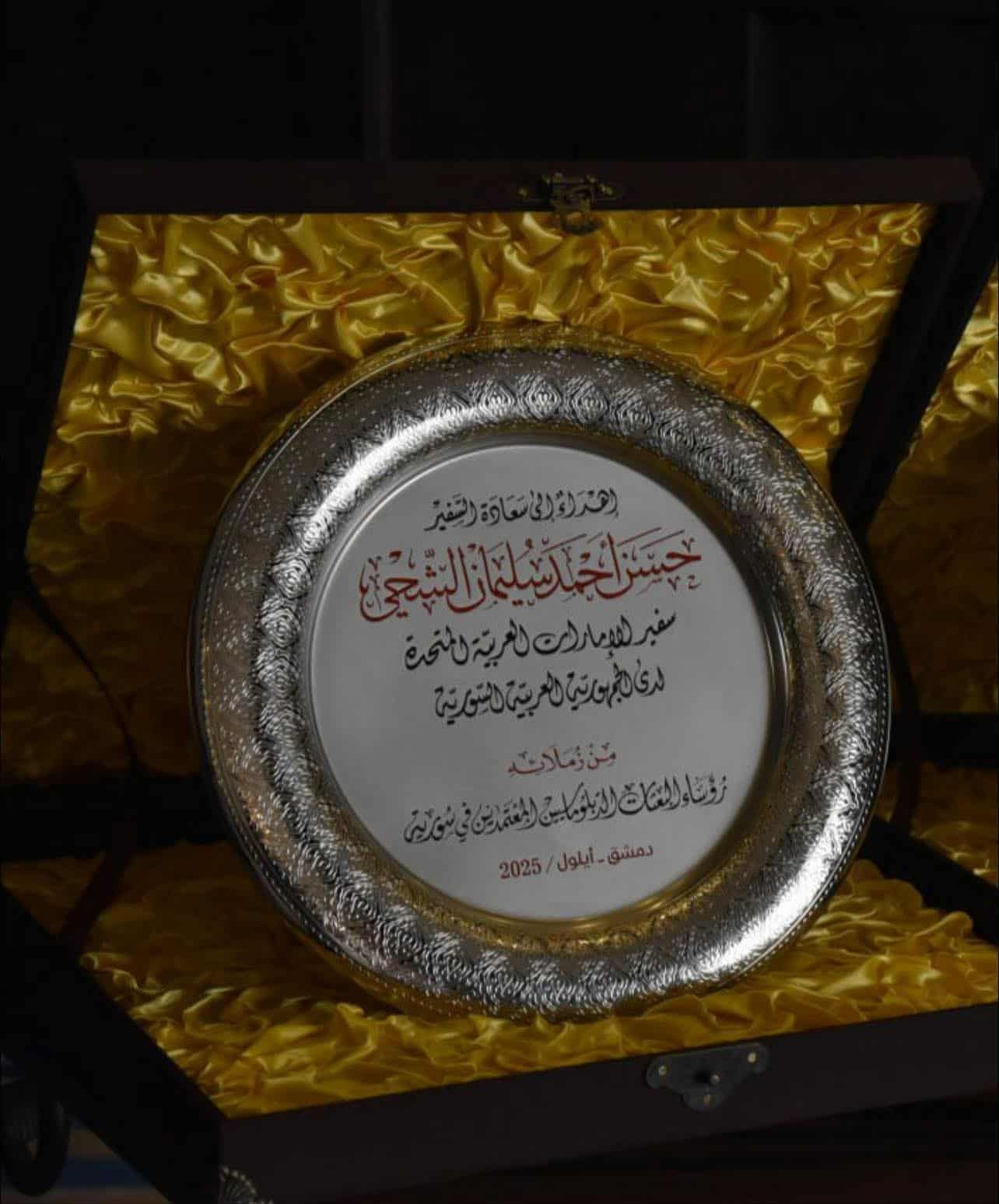 وخلال حفل وداع تكريمي أقيم في دمشق، جرى تقديم درع تكريمي من قبل رؤساء البعثات الدبلوماسية المعتمدين في سوريا تقديراً لدوره المميز في تعزيز العلاقات وتعميق الروابط الأخوية بين الشعبين.