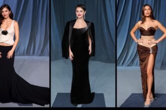 فيما ارتدت فستانًا ميتاليك فضيًا لامعًا بتصميم سترابلس أظهر كتفيها بانسيابية راقية.