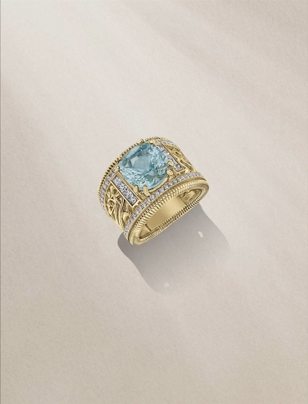 اختارت الفنانة شيرين رضا التألق بلون البحر والسماء عبر الأكوامارين، في مجوهرات من مجموعة “حديقة النور”، مع خاتم Art Deco Calligraphy Ring المرصع بحجر أكوامارين بوزن 4.4 قيراط.