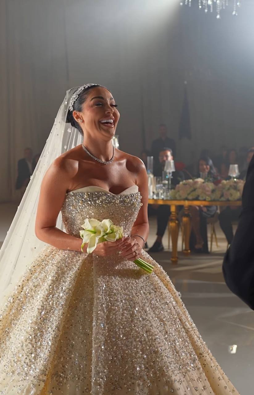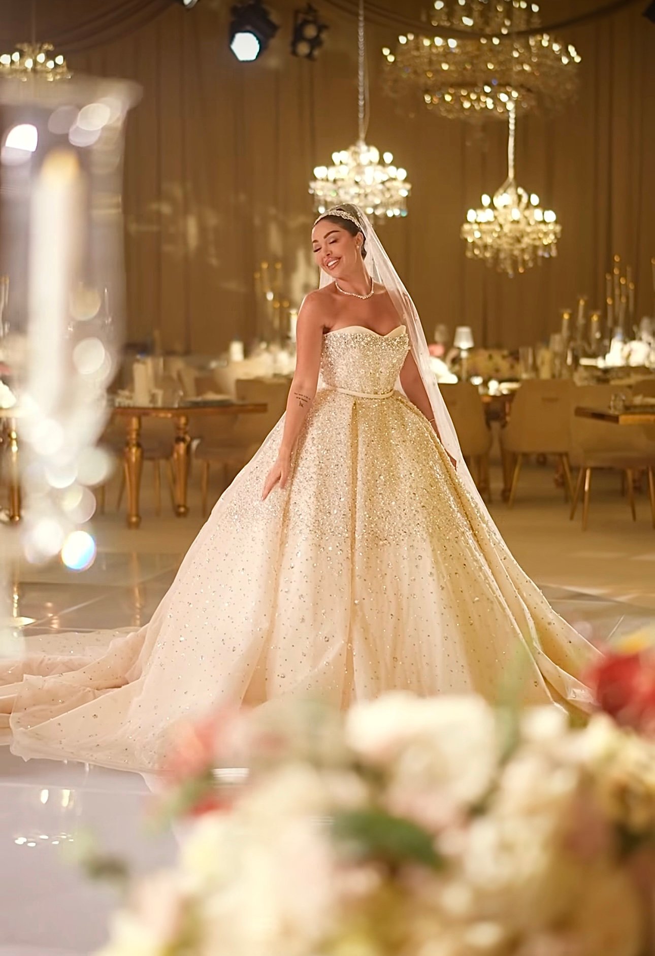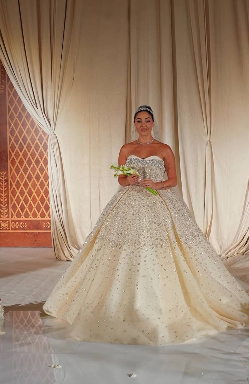 غطّت التطريزات الفاخرة من الكريستالات والخرزات الدقيقة الكورسيه والخصر، لتتألق العروس مع كل خطوة في قاعة تلمع تحت الإضاءة الذهبية.