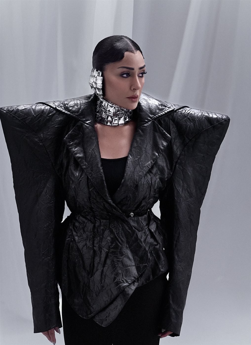 أما الإكسسوارات، فقد اختارت المعدنية الفضية حول الرقبة والأذنين، بتصميم هندسي يعكس روحًا مستقبلية قوية، لذلك تبرز ملامحها بحدة وقوة.