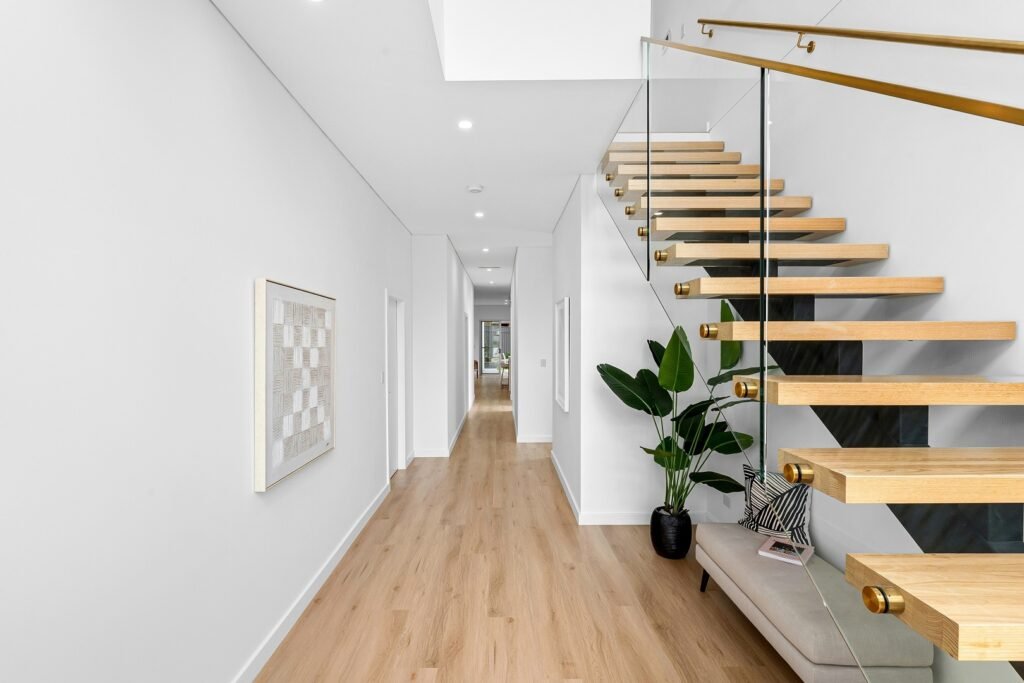 استغلي الفراغ لإنشاء نقطة بصرية جذابة عبر أرفف مدمجة تتماشى مع شكل الدرج. يمكن عرض الصور العائلية، الأعمال الفنية، أو قطع زخرفية، مع إضافة إضاءة دافئة لإبراز العناصر، وتجديد المعروضات دوريًا لكسر الرتابة.