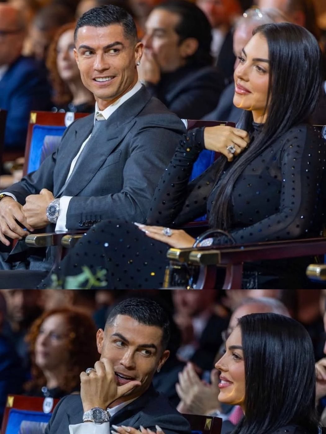 فيما بدا رونالدو جالسًا إلى جانبها، ينظر إليها برومانسية واضحة.