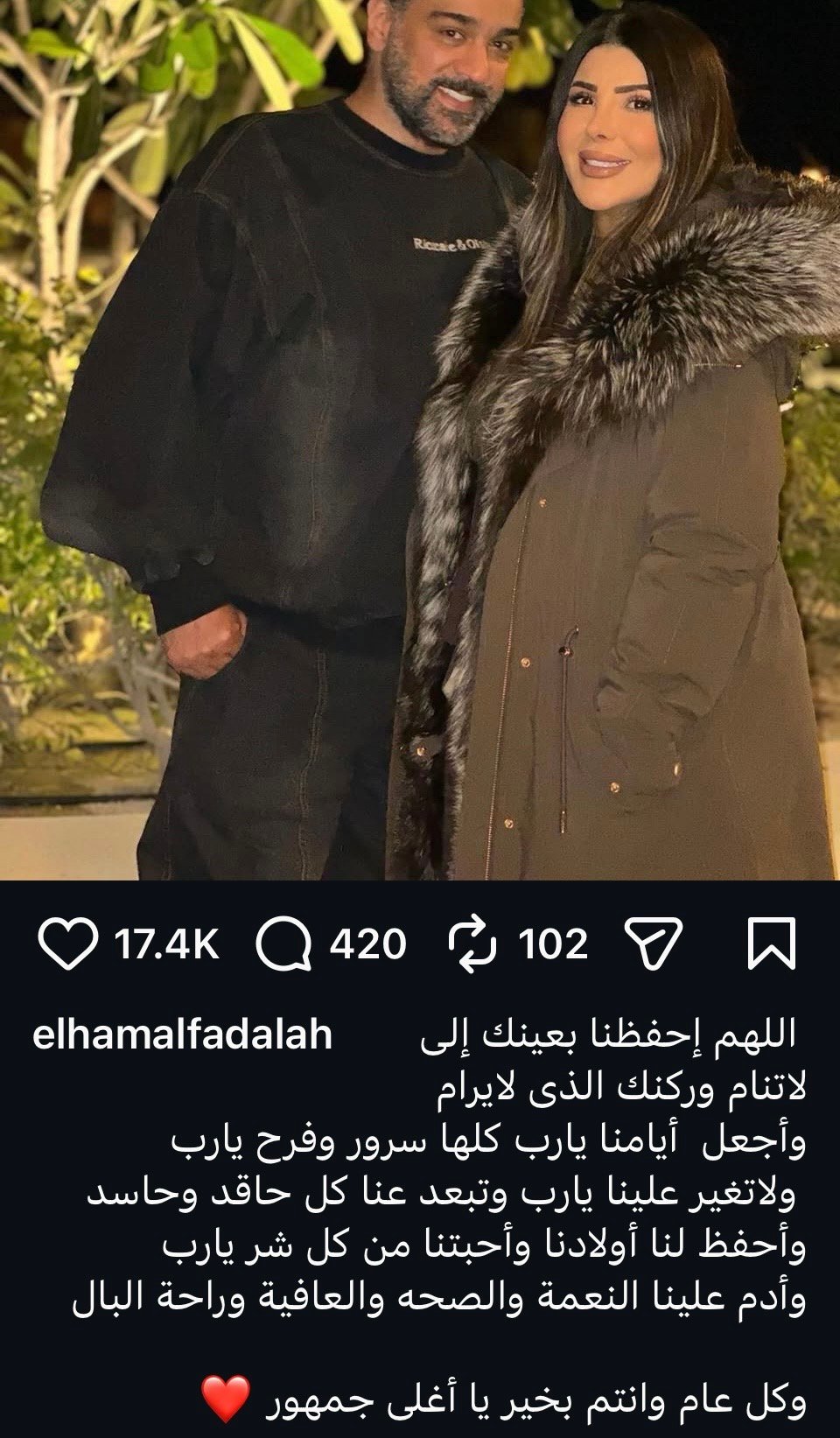 حرصت النجمة الكويتية إلهام الفضالة على استقبال العام الجديد 2026 برفقة زوجها شهاب جوهر، في أول ظهور لهما بعد انتهاء أزمتها وبراءتها من تهمة نشر معلومات مضللة.