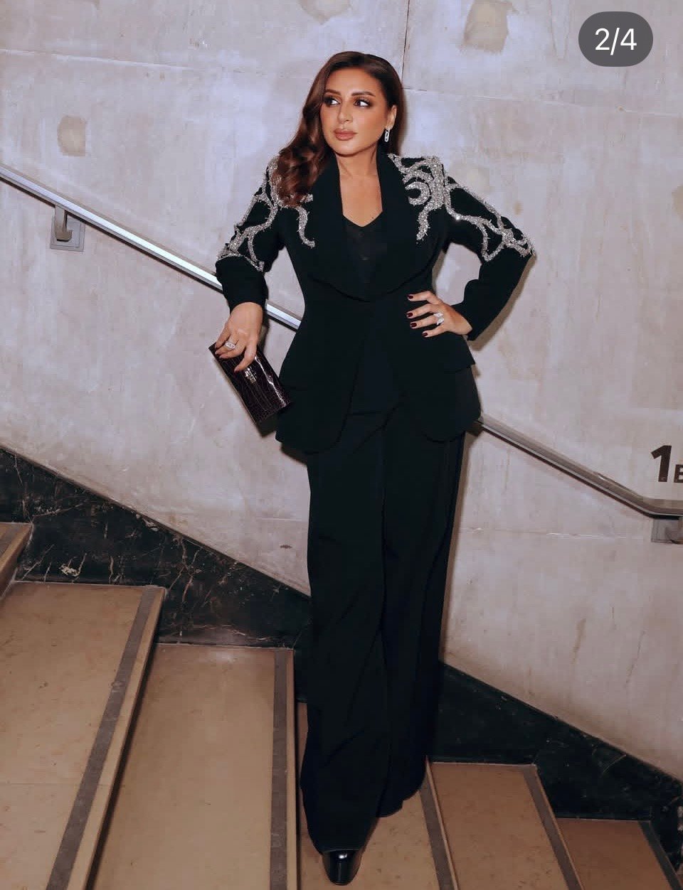 ارتدت أنغام بنطلونًا وجاكيتًا باللون الأسود مزينًا بفصوص من الألماس، من تشكيلة الهوت كوتور لموسم ربيع وصيف 2026.