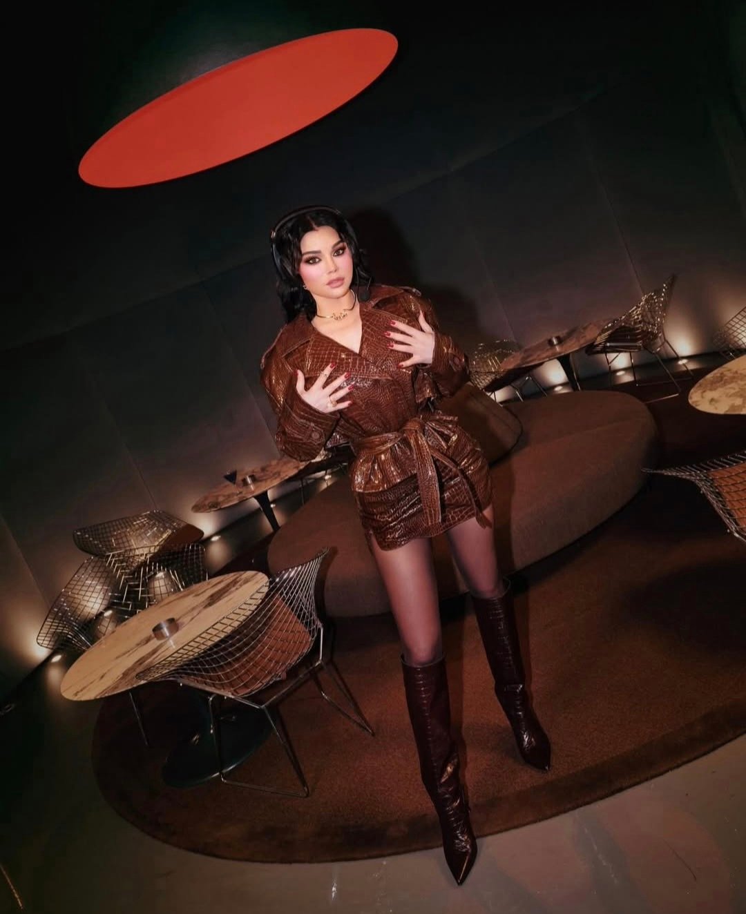 بينما تجمع بين الجرأة والرقي في اختياراتها. وقد اعتمدت النجمة إطلالة متكاملة من الجلد بنقشة التمساح، باللون البني الدافئ، وهو لون من أبرز درجات الموسم لما يمنحه من إحساس بالفخامة والدفء.