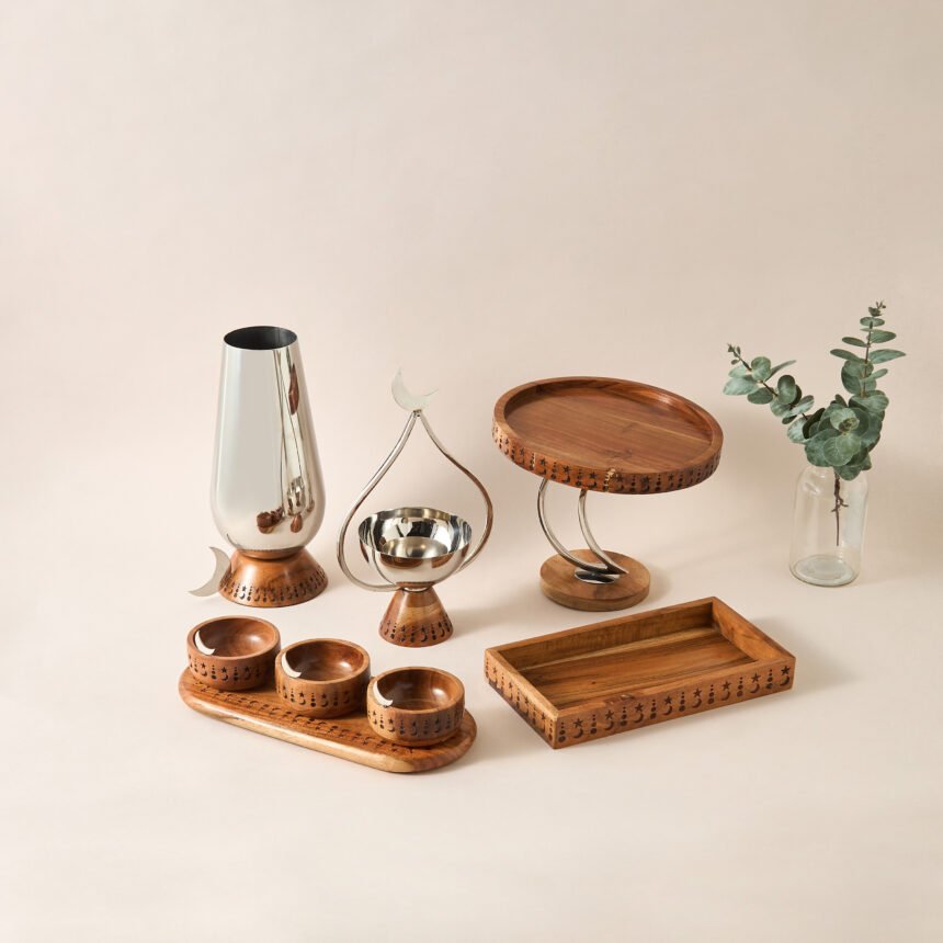 استقبلي ضيوفكِ بحفاوة مع هذا الطقم الخشبي الفاخر المكوّن من ثلاثة أوعية صغيرة بأشكال مفرغة للقمر والنجوم مع صينية ذات شكل متطابق. مناسب تمامًا لتقديم المكسرات أو الصوصات أو السناكس ليغمر مائدتكِ بأجواء البهجة والاحتفال.