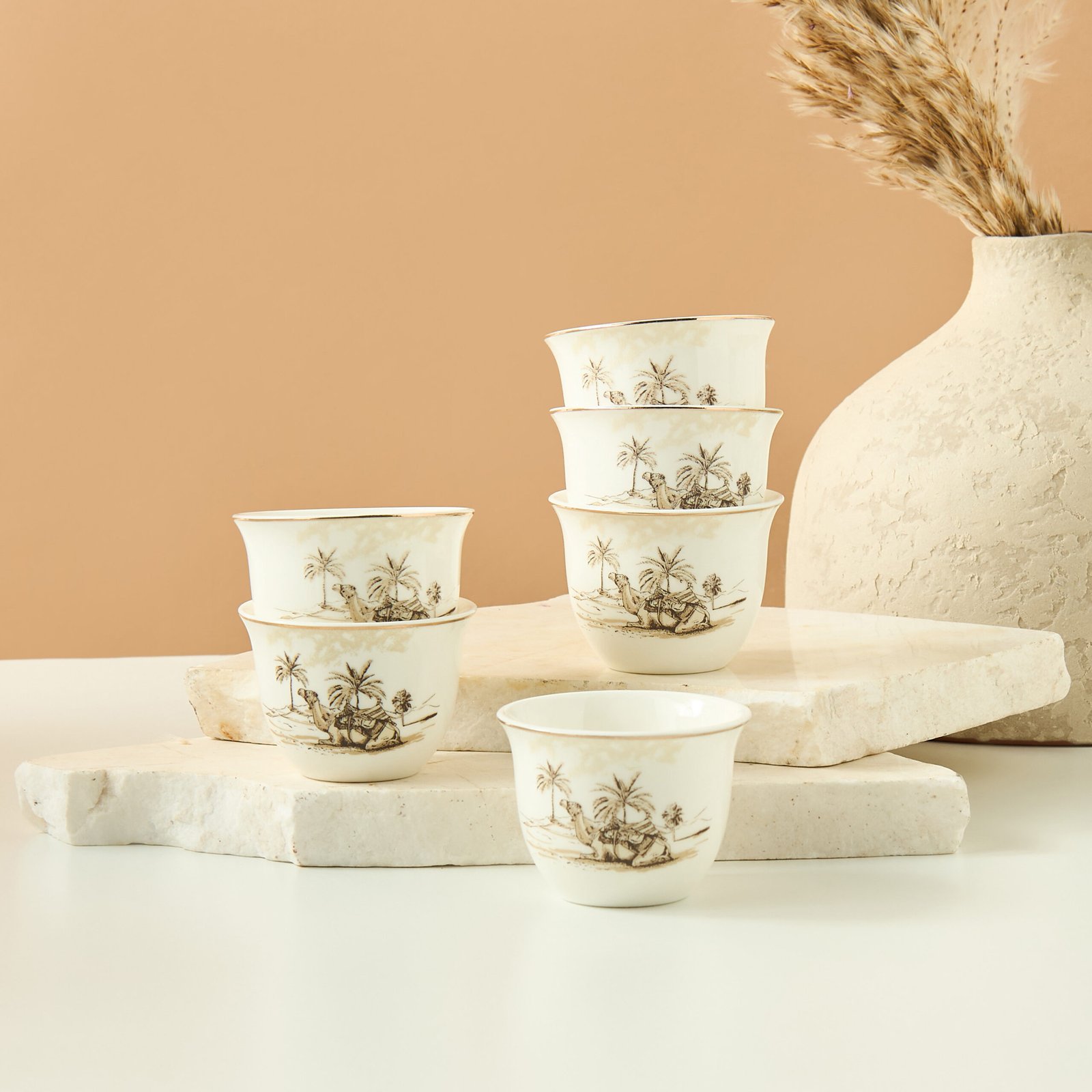 طقم فناجين قهوة مكوّن من 6 قطع من البورسلين المتين (نيو بون تشاينا) تزينه رسمة جمل (من مجموعة ’رحلة عبر الكثبان‘ أو Journey Across the Dunes Collection) –