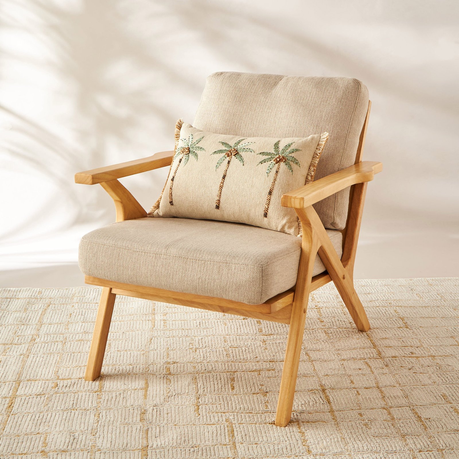 إن هذه الوسادة بما يزينها من تطريز لشكل أشجار النخيل وألوانها المحايدة تضفي جوًا رمضانيًا دافئًا على أي مساحة بمنزلكِ. وبفضل تفاصيلها المتقنة وأطرافها ذات الشكل المميز، تُعد خيارًا مناسبًا لتجديد مظهر الأرائك والمقاعد بلمسة من الرقي والبساطة.