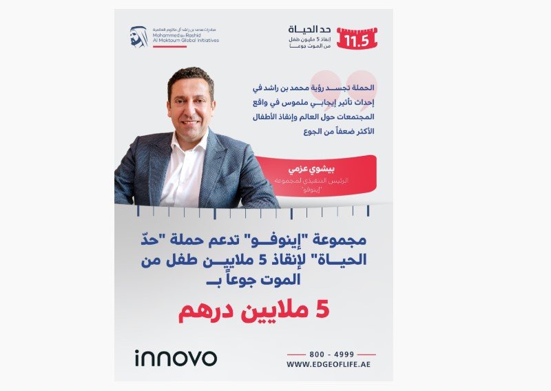 أعلنت “مجموعة إينوفو” عن مساهمتها بمبلغ 5 ملايين درهم دعماً لحملة “حد الحياة” لإنقاذ 5 ملايين طفل من الموت جوعاً، والتي أطلقها صاحب السمو الشيخ محمد بن راشد آل مكتوم نائب رئيس الدولة، رئيس مجلس الوزراء حاكم دبي “رعاه الله، بالتزامن مع شهر رمضان الكريم، لجمع مليار درهم على الأقل يتم استثمارها في تنفيذ برامج ومشاريع مستدامة تسهم في مكافحة جوع الأطفال في العالم.