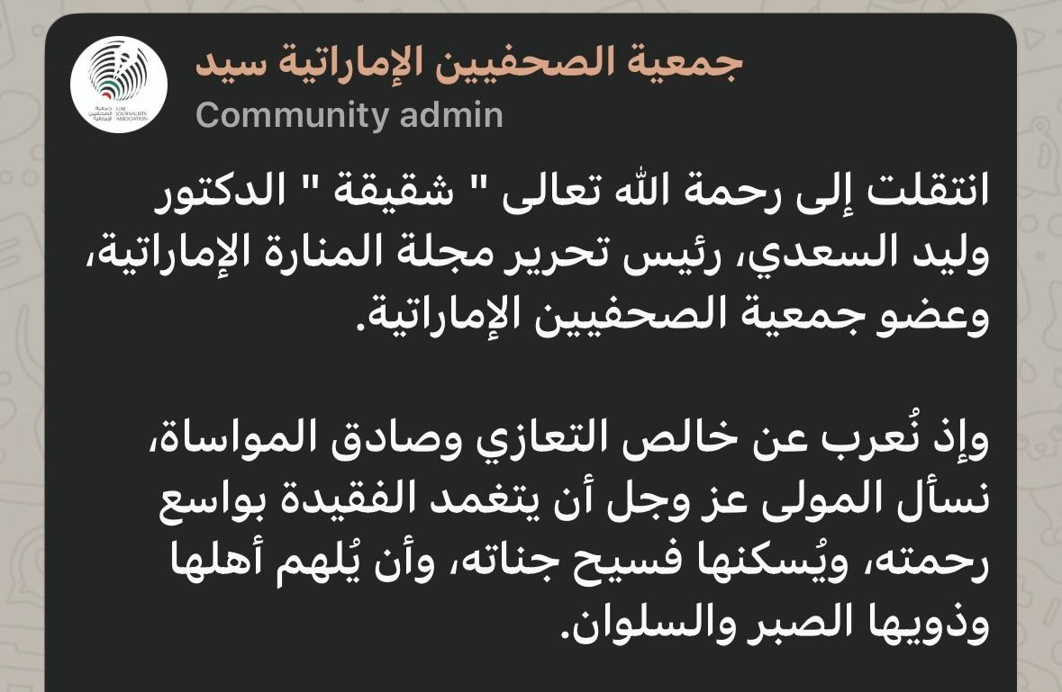 انتقلت إلى رحمة الله تعالى ” شقيقة ” الدكتور وليد السعدي، رئيس تحرير مجلة المنارة الإماراتية، وعضو جمعية الصحفيين الإماراتية.