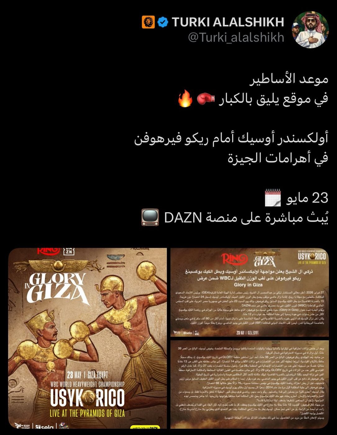 ضمن عرض يحمل عنوان “Glory in Giza”، على أن يبث حصريا عالميا عبر منصة DAZN.