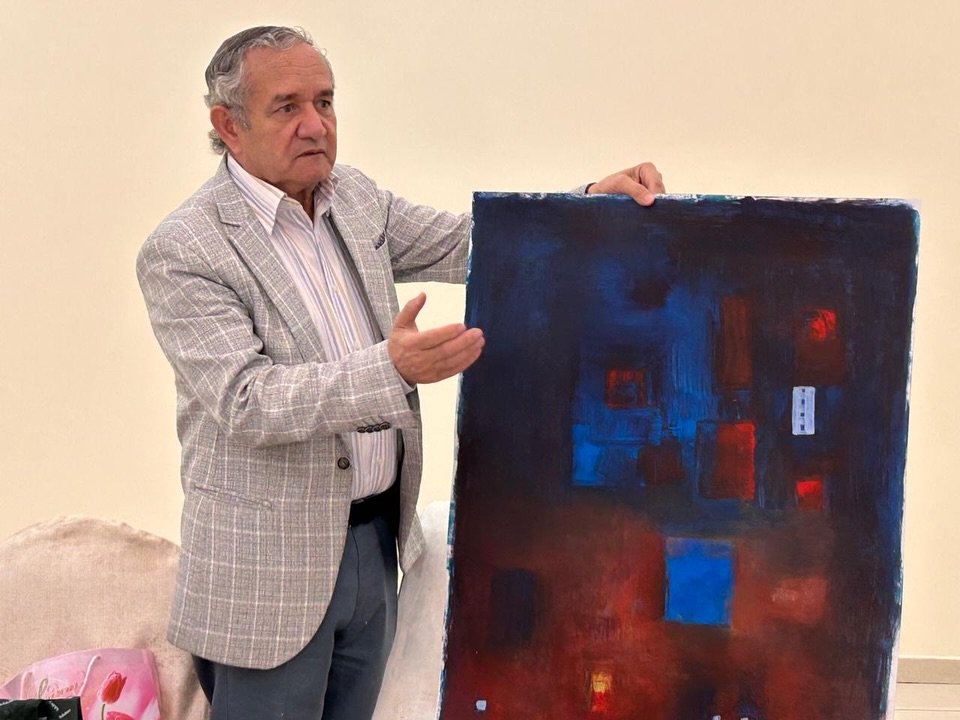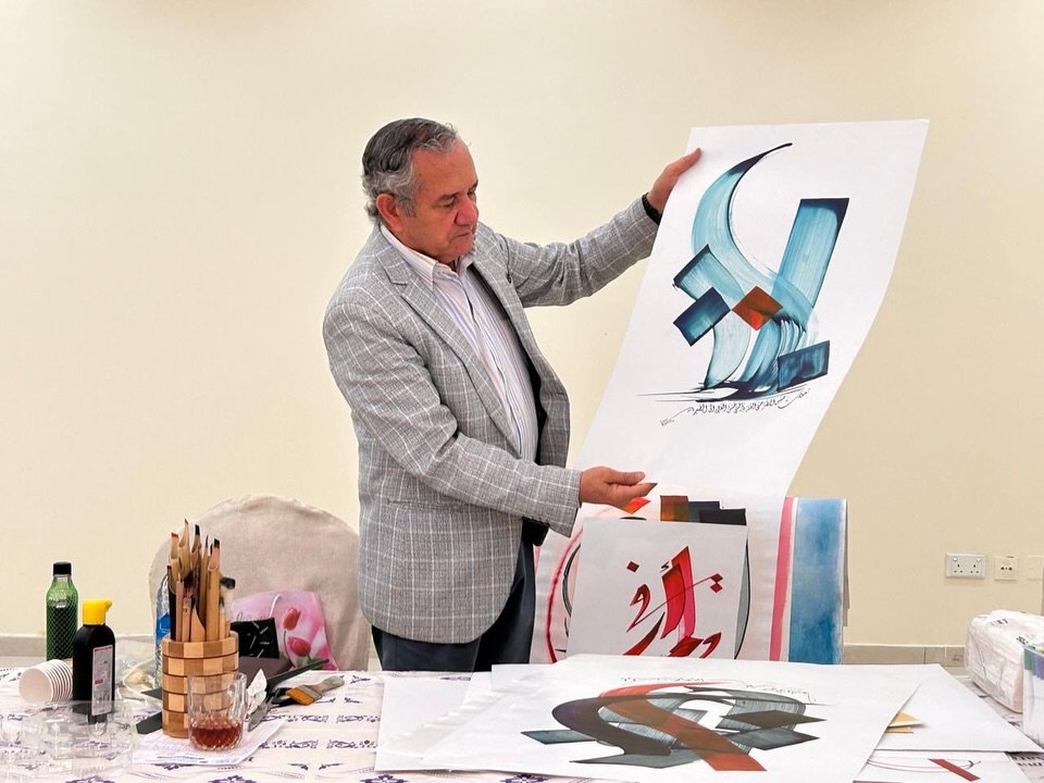 إلى جانب ذلك، قدم عرضاً عملياً لبعض لوحاته. وشرح مراحل بناء العمل من الفكرة حتى التنفيذ. كذلك أوضح الأدوات والخامات التي يستخدمها. وبين طرق المزج بين المدارس الخطية المختلفة.