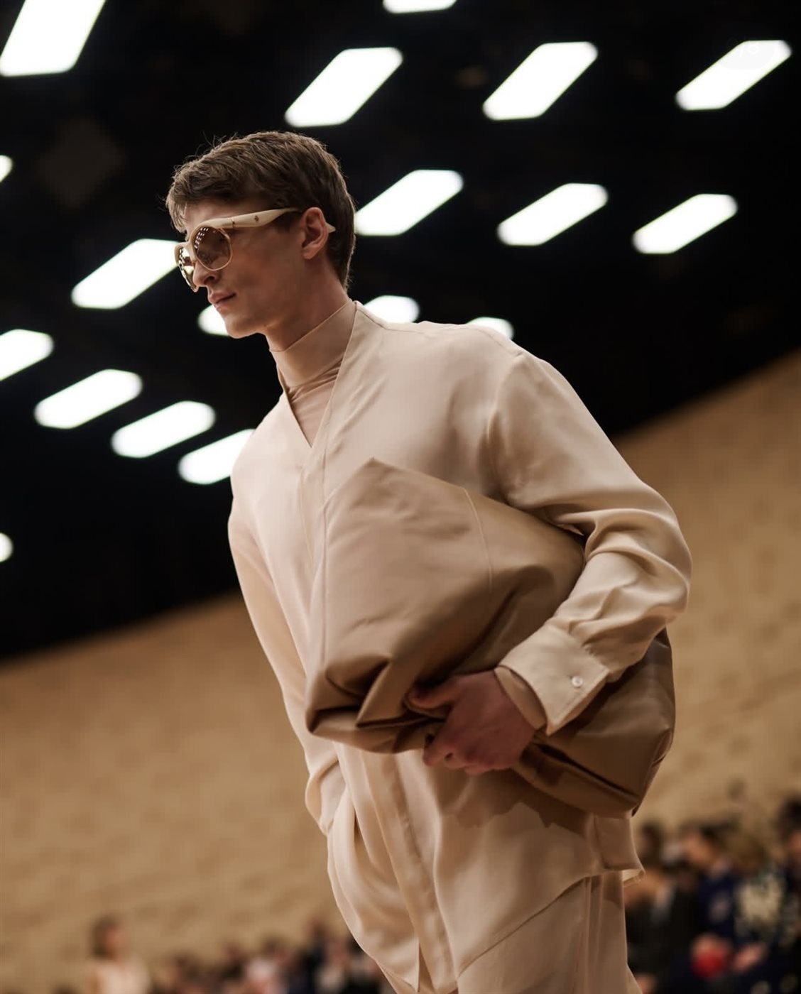وعلى مستوى الخامات، لعبت المواد دور البطولة؛ إذ اعتمدت المجموعة على جلود مصقولة وأقمشة ذات لمسات تقنية ولمعان خفيف.