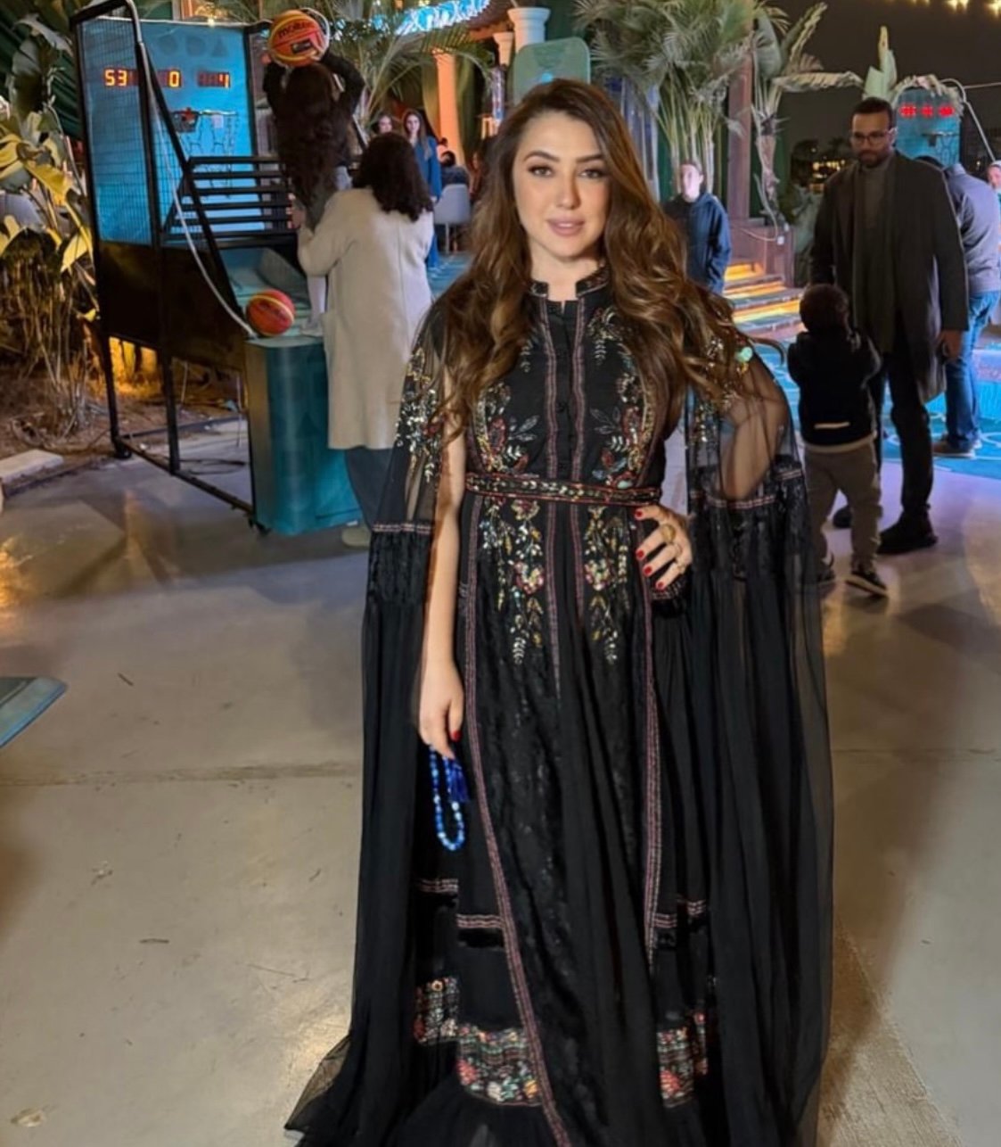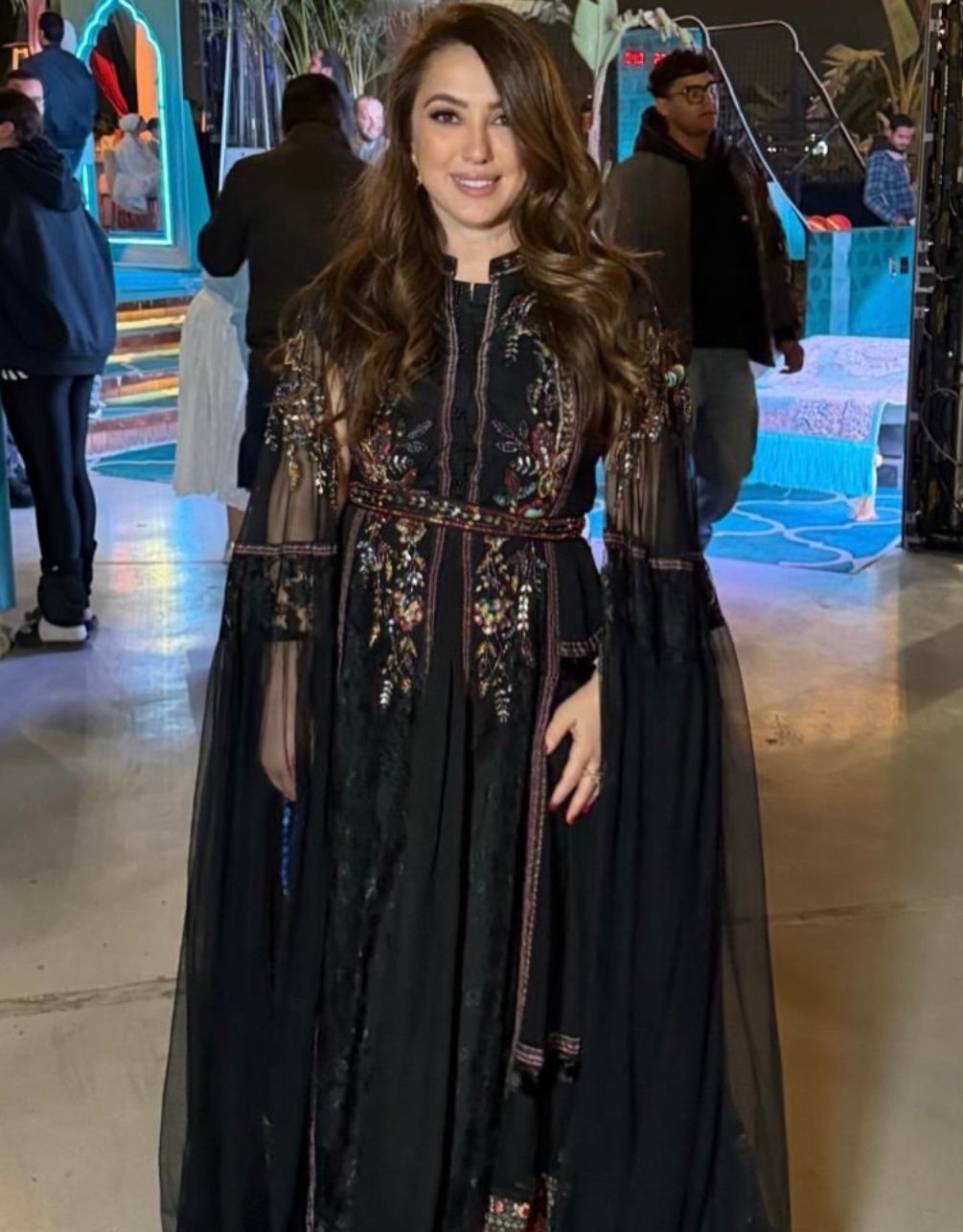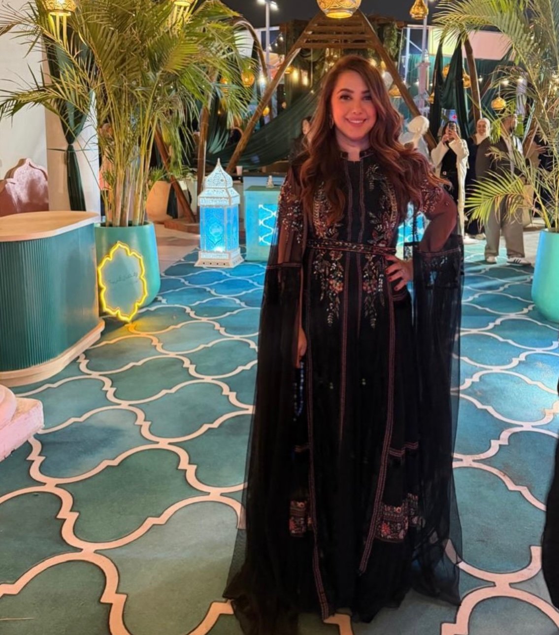 بينما جاءت هذه التطريزات بألوان متعددة أضفت حيوية على اللون الأسود، لتمنح الإطلالة توازناً بصرياً يجمع بين الكلاسيكية والحداثة.