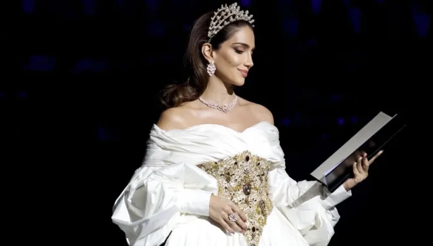 بينما تميّز التصميم بـ”كورسيه” فاخر في منتصف الفستان، مرصّع بتطريزات ذهبية وأحجار كريستالية ملوّنة.